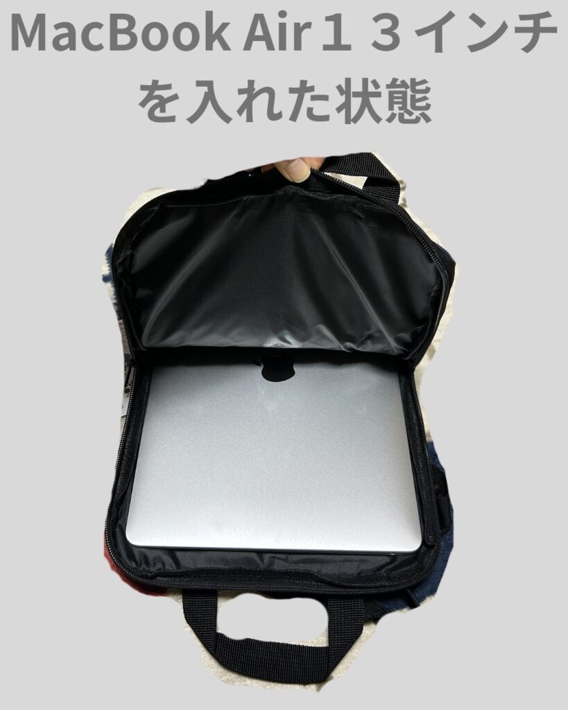 れていますが、私が使っているMacBook Air13インチがピッタリ入ります(PCカバーはしてい